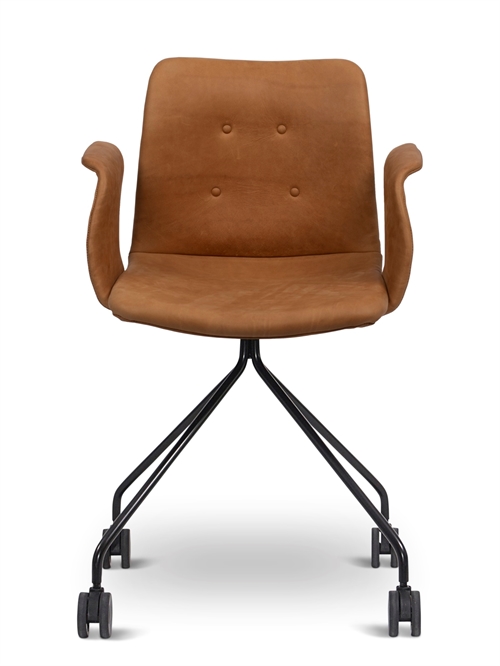 Primum stolen er polstret med Davos Brandy 2758, som er et naturligt anilinlæder. Læderet har en rustik overflade, som bidrager til det naturlige og klassiske udtryk. Læderet produceres økologisk sikkert i henhold til love og regler og uden AZO farver.