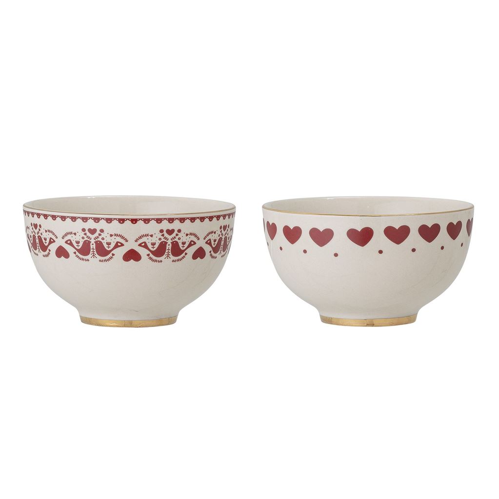 Jolly skålene fra Bloomingville er en hyggelig tilføjelse til din samling. Julestemningen kan blive en lille smule højere hvis man spiser ud af en juleskål. Julemotivet er minimalistisk og gør også at skålene nemt kan bruges hele året rundt. Den ene skål har en rød kant af hjerter hele vejen rundt og den anden har en rød kant af turtelduer. Begge skåle har et hjerte i bunden af indersiden af skålen, så når du færdiggør din snack eller morgenmad bliver du mødt med synet af et lille rødt hjerte. Nyd en skål risengrød eller snacks med en god ven, familiemedlem eller nyd en stund alene.