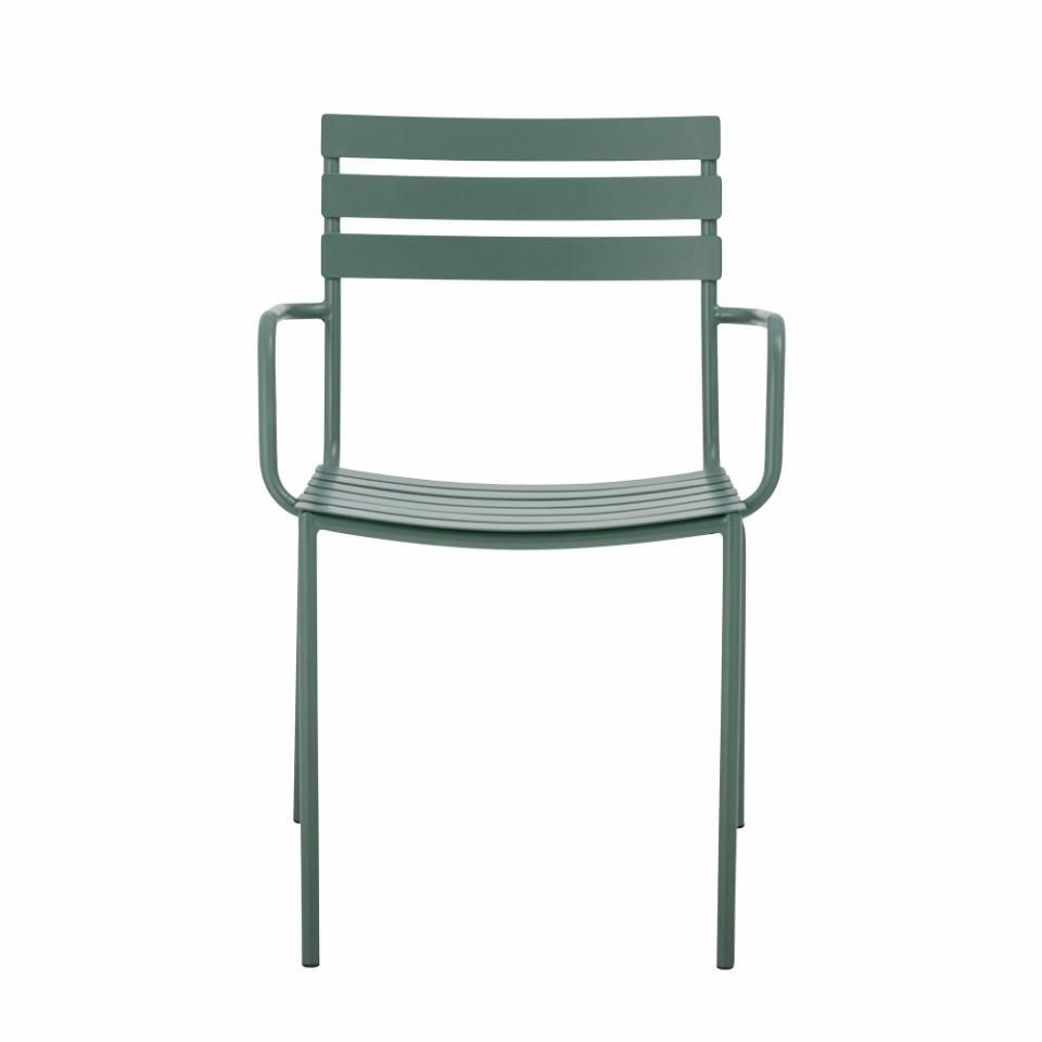 Monsi Spisebordsstol fra Bloomingville i galvaniseret jern og en grønlig farve. Stolene kan stables og er derfor perfekte til terrassen.