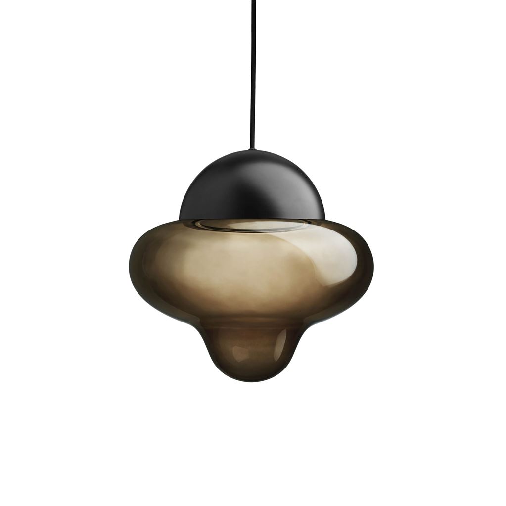 Skøn pendel fra Design By Us. Med Nutty pendlens sjove udtryk kan du tilføje et legende udtryk til indretningen. Nutty skaber, som navnet ligeledes afslører, klare associationer til et agern, hvorfor lampen har organiske og naturlige former. Sammen med lampens mundblæste glas i en smuk brun farve kombineret med den flotte deltalje i form af den sorte halvkuppel vil Nutty som belysningsløsning pryde enhver bolig, hvor den vil tilføre elegance med et strejf af humor. Brug eksempelvis Nutty pendlen som en smuk spisebordslampe eller i hjørnet af stuen for at skabe hyggelig belysning. Du kan med fordel sammensætte flere Nutty pendler i flere farver og størrelser for at skabe et legende udtryk. Nutty fås i flere størrelser såvel som farver i både glas og kuppel.