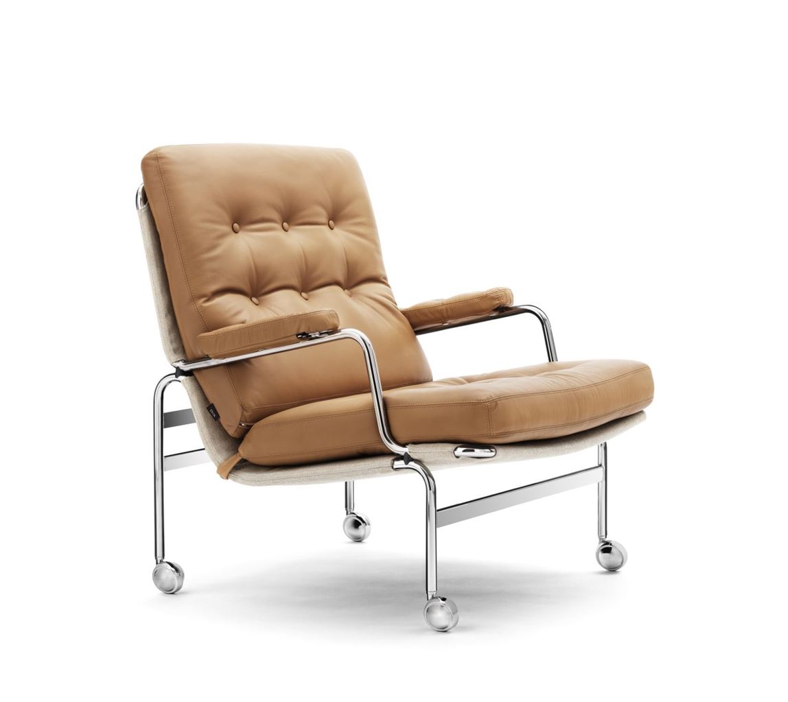 DUX Karin Lænestol - Camel/LæderKarin lænestolen blev designet af Bruno Mathsson i 1969 kg har knapper i ryg og sæde. Hynderne er behageligt polstrede med pol Se mere ...