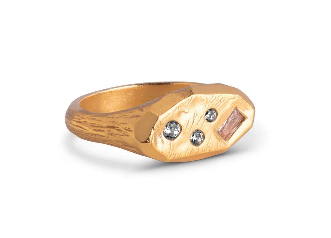 Aia ringen fra Enamel Copenhagen har den perfekt kombination mellem det feminine og det rå, med de flotte zirkoner. Den chunky stil med den ru og kantede overflade er iøjnefaldende og er en hver kvindes beundring.