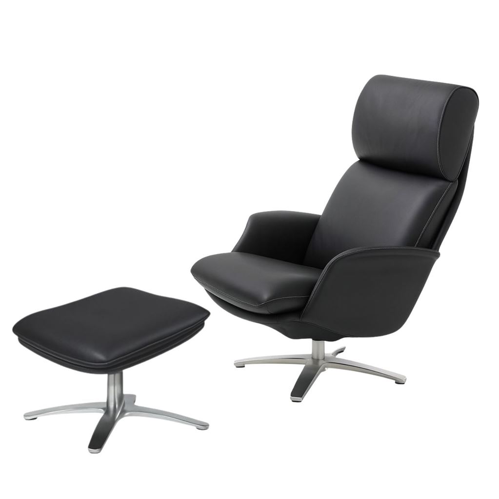 BERG Furniture Nasa Høj Lænestol m. Justerbar Nakkepude inkl. Skammel SH: 46 cm - Mat Aluminium/Berg Soft Sort Læder
