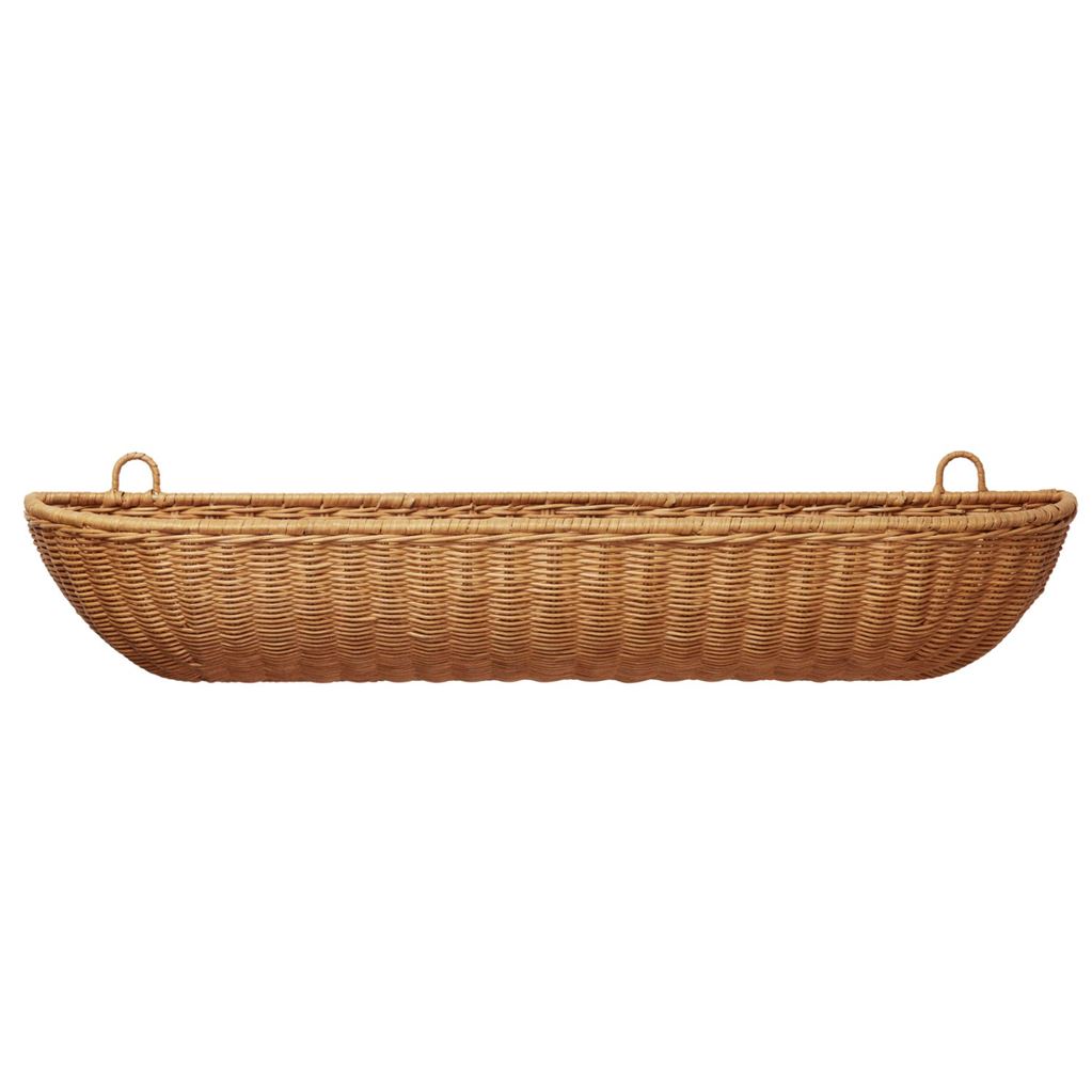Flettet Vægopbevaring kommer i et opdateret, aflangt design, der kan rumme mange forskellige opbevaringsbehov. Den er håndflettet i naturlig rattan og understøttet af en solid jernramme, som giver både styrke og struktur. Den bløde, kanoformede silhuet tilfører et organisk præg, mens de indbyggede løkker gør den let at hænge op på væggen. Perfekt til opbevaring af legetøj og småting, bringer den en naturlig varme og charme ind i ethvert rum.