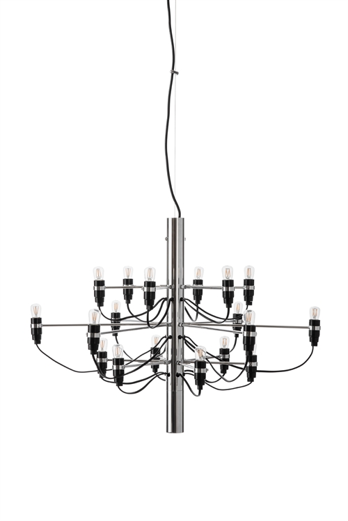 Elegant lysekrone med 18 arme i krom fra FLOS. Lysekronen er optimal til større rum som for eksempel store entreer, spisestuer eller festsale. Lampen har en utrolig flot udstråling og giver et næsten majestætisk udtryk, når den er tændt. Lampen har en 2,8 meter lang sort ledning, 20 parfumepærer medfølger.