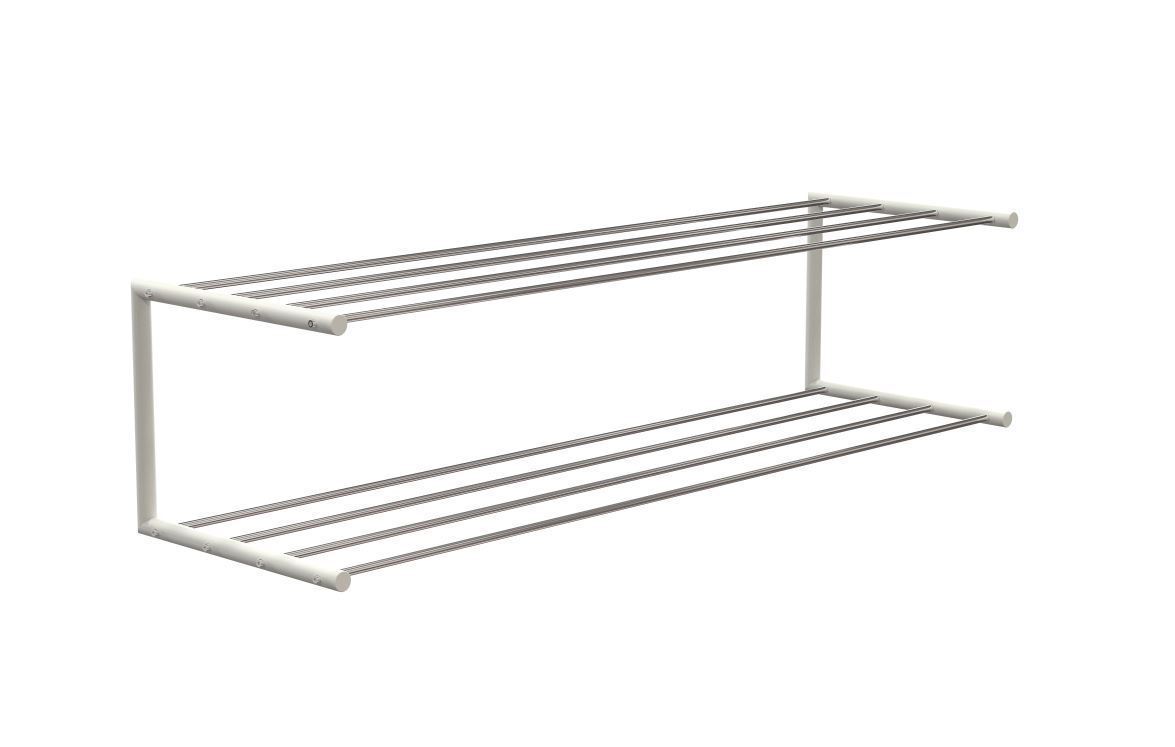Elegant dobbelt skohylde fra FROST. Skohylden har en længde på i alt 101,9 cm, og måler 100 cm mellem skuehullernes midtpunkter. Skohylden er lavet i rustfrit stål og har et poleret og mat hvid finish. Hylden er en del af NOVA serien, bestående af tilbehør til garderobe, badeværelse og køkken. Brug skohylden i gangen, entréen eller måske soveværelset. Fødder til skohylden kan tilkøbes.