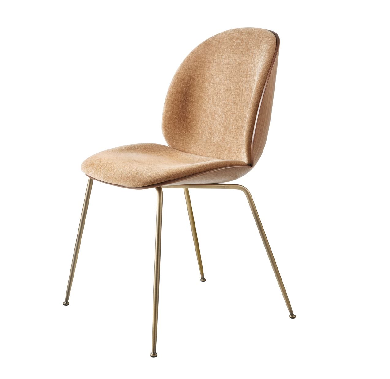 GUBI Beetle Dining Chair Conic Base - Antique Brass Base/Walnut Shell/BelsuedeSmuk stol fra GUBI. Den flotte Beetle spisebordsstol har et let og elegant desig Se mere ...