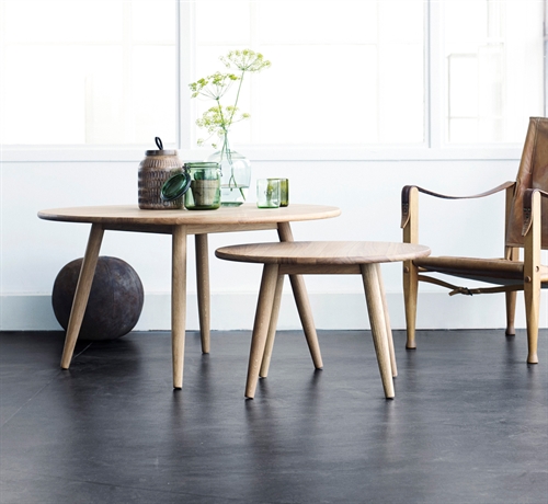 Lampebord fra Haslev i massiv sæbebehandlet eg Ø63 (det lille bord på billedet). Kan også bruges i kombination med sofabordet fra samme serie, eller som sidebord.