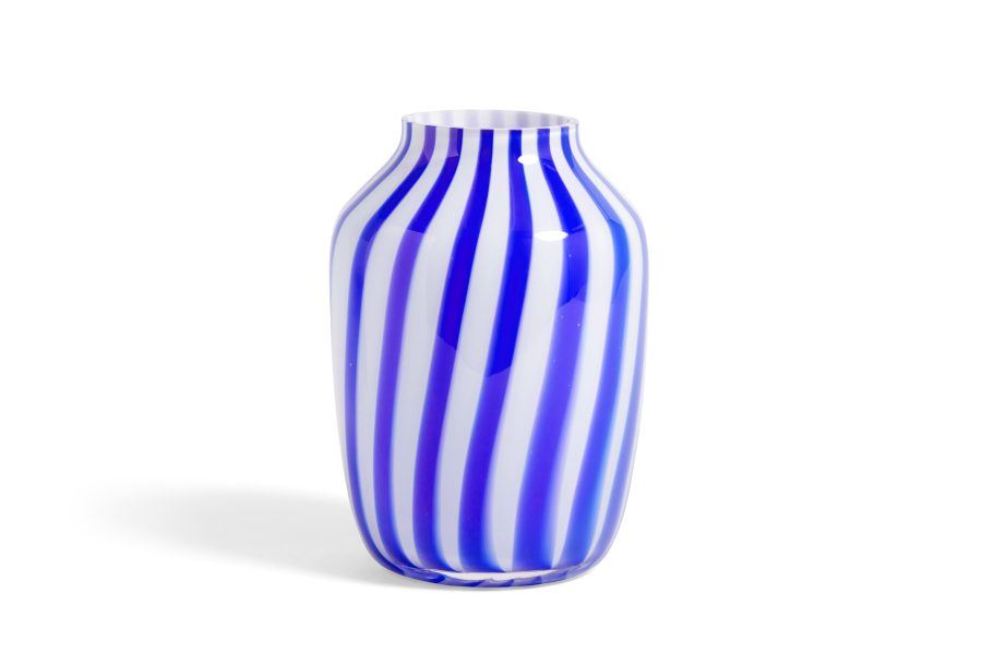 Juice vasen er designet af den norske designer Kristine Five Melvær for HAY. Vasen har en frisk blå farve og de lodrette hvide striber skaber en fin farvevarians i glasvasekollektionen. Vaserne fås i to størrelser og i tre forskellige farvekombinationer. Vasens kan kombineres med en bred række indretninger, og den har mulighed for at tilføje et frisk pust til indretningen.vasen er mundblæst og der kan derfor forekomme forskellig udtryk i vasen