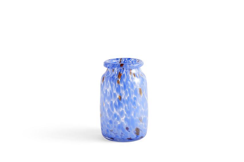 Splash vasen fra HAY er håndlavet i form af en helt speciel glaspusteteknik. Teknikken kræver mange forskelligfarvede glaspletter der til sidst ender som et yndigt hvirvelmønster. Vasen har en smuk og elegant rullet hals, som i samspil med den flotte blå farve giver et ekstra mildt udtryk.
