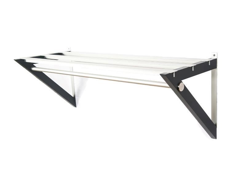 En nydelig HH-6 Hattehylde fra Hoigaard. Hattehylden er en kombination af en vandret overflade til cykelhjelme eller opbevaringskurve og en bøjlestang til overtøjet. Træets farve og det eloxeret aluminium giver en elegant blanding af de enkelte materialer. Eloxeret aluminium er slidsstærkt materiale.