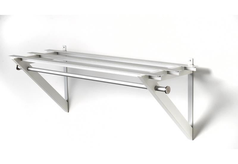 En nydelig HH-7 Hattehylde fra Hoigaard. Hattehylden er en kombination af en vandret overflade til cykelhjelme eller opbevaringskurve og en bøjlestang til overtøjet. Træets farve og det eloxeret aluminium giver en elegant blanding af de enkelte materialer. Eloxeret aluminium er slidsstærkt materiale.