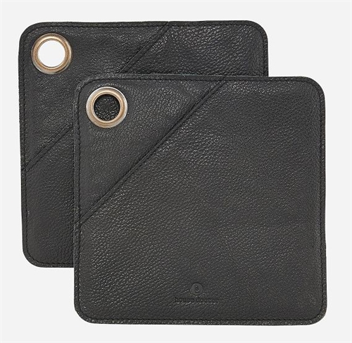 Et par flotte grydelapper i læder fra House Doctor. Grydelapperne er lavet af okseskind i en flot sort farve. Grydelapperne er med til at give et fedt, maskulint look i køkkenet. Sættet består af 2 stk. grydelapper. Kan behandles med læderfedt.