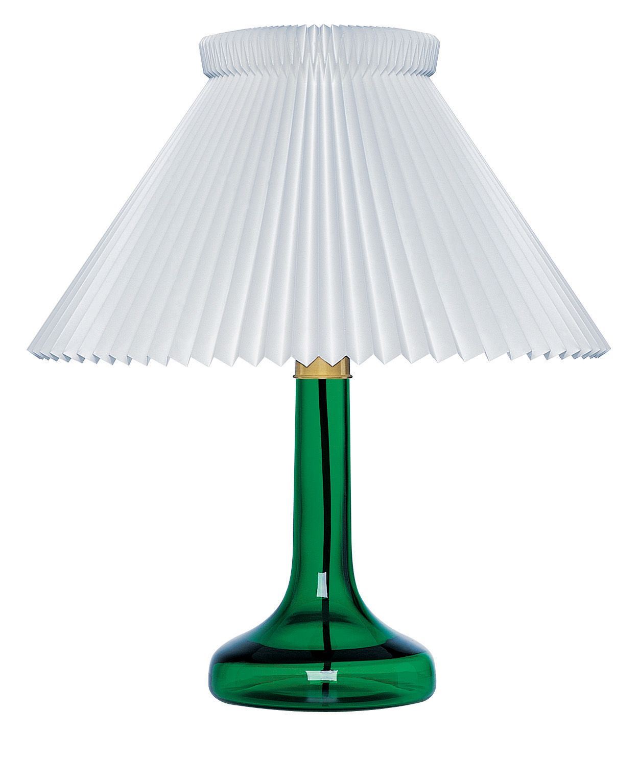 Smuk og tidløs lampe fra Le Klint. Lampen er designet af Gunnar Biilmann-Petersen i 1948, og er specielt tegnet til de håndfoldede lampeskærme, som Klint-familien producerede, da virksomheden startede i 1943. Den skønne lampefod er fremstillet i transparent glas, hvilket giver mulighed for at se ind til ledningen, der ligner et sort udråbstegn. Lampens enkle form komplementerer utroligt fint de hvide, plisserede lampeskærme. Brug den unikke lampe på skænken i stuen, i soveværelset eller hvor der ellers er brug for lidt ekstra lys og farve.