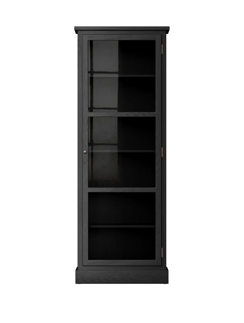 Skønt vitrineskab fra Lindebjerg Design lavet af eg i en smuk bejdset dyb sortbrun farve. Dark Oak N1 vitrineskabet er en specialudgave af N-serien. Skabet har en varme og tekstur, der virkelig tillader den sarte træstruktur at komme til syne. N1 Dark Oak vitrineskabet er designet med greb og hængsler i messing og en forenklet topprofil og har en højrehængt dør.