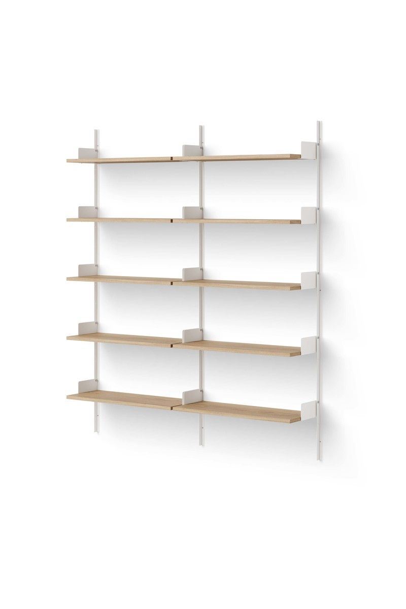 Denne væghængte hylde fra New Works er en praktisk vægreol der kan hænges flere steder rundt omkring i hjemmet. Den er designet til at blende ind i indretningen. Hylderne har indbyggede bogsstøtter på hver ende samtidig med at de også fungerer som monteringselement til vægskinnerne. Dette reolsystem kan vokse med tiden da der frit kan tilføjes enkelte hylder eller hele reoler til dit eksisterende modul.