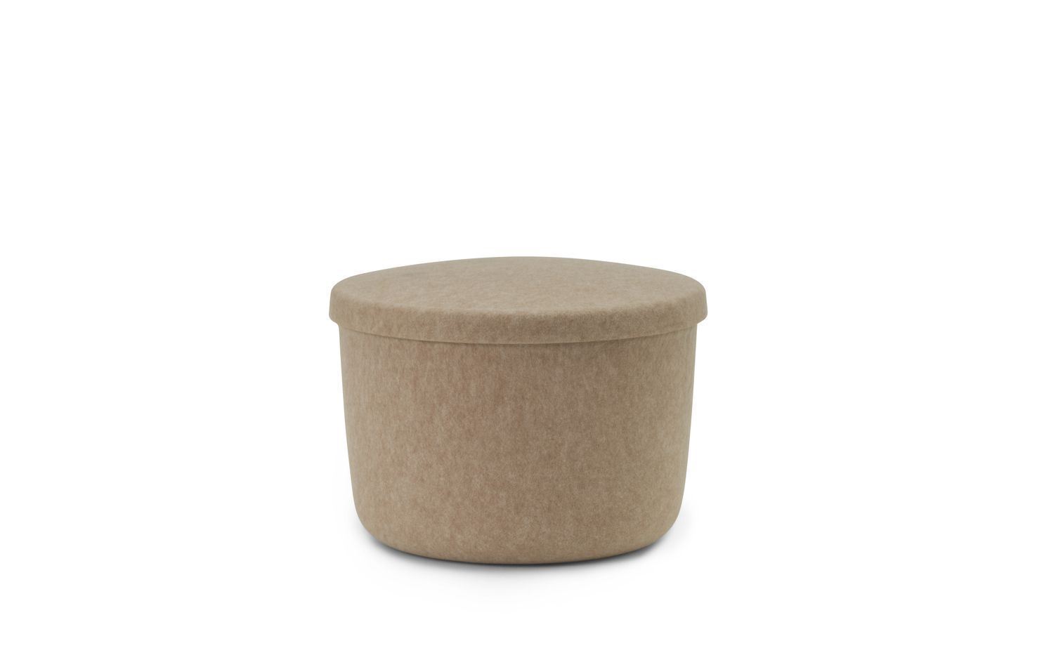 Puf fra Normann Copenhagen. Hide puffen er en puf med et opbevaringsrum. Den er fremstilliet i PET-filt, som er lavet af plastflasker der er ekstruderet til polyesterfibre og efterfælgende presset til filt. Sædet på puffen kan nemt fjernes og opbevaringsrummet kommer frem.