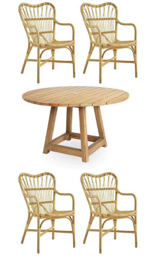 Dette havemøbelsæt fra Sika-Design består af de smukke Margret spisebordsstole, med et let og elegant udtryk samt George spisebordet. Stolene er solide og da de er fremstillet i et vejrbestandigt materiale, kan de stå udenfor året rundt. Det runde havebord er fremstillet af gammelt teaktræ fra fiskerbåde og huse og designet udstråler genanvendelighed. Havebordet er tidløs og klassisk og vil kunne passe ind i indretningen i mange år. Fordelen ved teaktræ er, at det kræver minimal vedligeholdelse - dog vil træet med tiden få en sølvgrå farve, hvis ikke de olieres med teaktræsolie.
