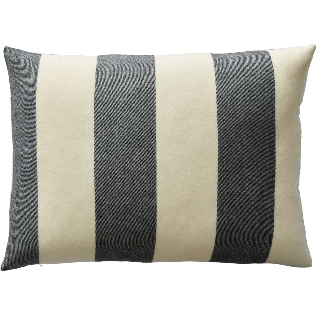 Designet er præget af brede, grafiske striber, der kombinerer det klassiske og tidløse og tilfører indretningen et elegant løft. Striberne er omhyggeligt forskudt, så de lyse og mørke nuancer mødes med præcision, når puden betragtes ovenfra.