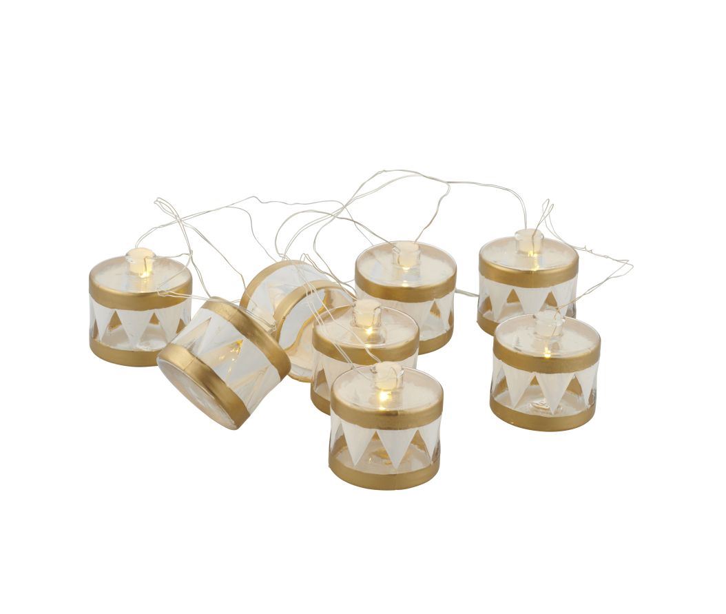 Sirius Elly Garland Lyskæde er 1,50 m + 30 cm lang og har 8 små fine (Ø: 4,5 cm x H: 4 cm) guld trommer. Lyskæden kan bruges i alverdens dekorationer eller som pynt på et lille juletræ. Lyskæden er batteridrevet. Du skal bruge 2 x AA batterier (ikke inkluderet). Kan kun benyttes indendørs.