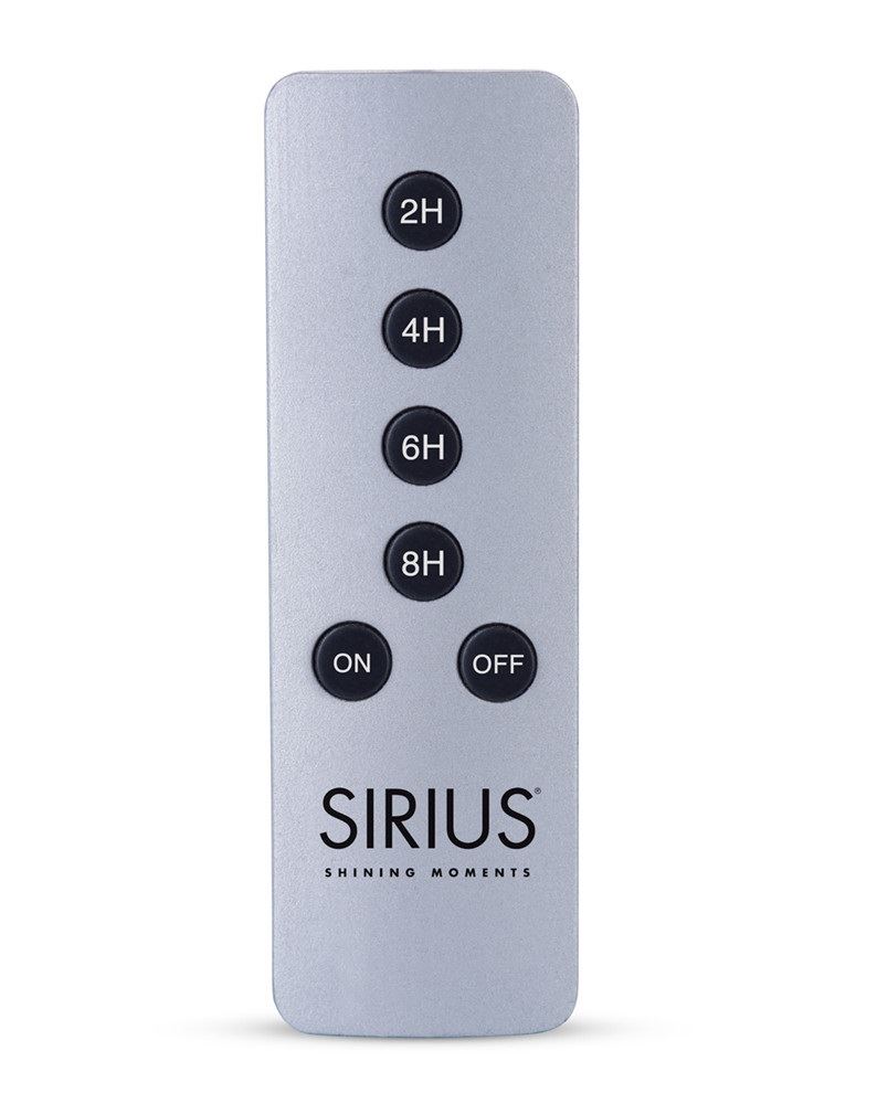 Smart fjernbetjening fra Sirius der lader dig styre dine Siriusprodukter med få tryk. Du kan tænde eller slukke dine lys, eller vælge mellem 2, 4, 6 eller 8 timers timer funktion. Sættes timeren på to timer, slukker alle lys igen efter de to timer, og efter 22 timer tændes lysene igen og sådan vil det fortsætte indtil du trykker på sluk. Fjernbetjeningen leveres inklusiv batteri. Fjernbetjeningen kan bruges til udvalgte serier fra Sirius.