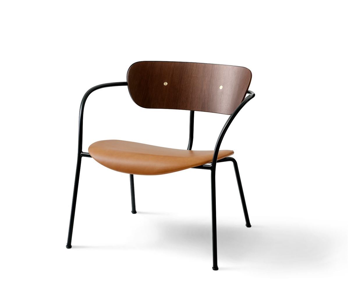 Den minimalistiske Pavilion lænestol fra &Tradition har med sit smalle stålstel og den bredde siddeflade betrukket med eksklusivt læder, et unikt og elegant design. Trods sine enkle linjer er stolen yderst robust, og giver sublim siddekomfort med det let bagudlænende rygstykke i formspændt finér. Det sortlakerede stålstel giver i kombination med det mørke valnøddetræ og samlinger i messing et eksklusivt design.